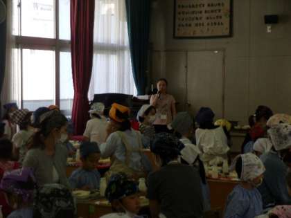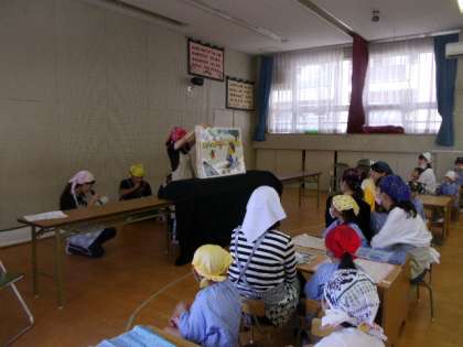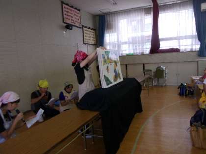 堀江幼稚園のうみぐみさんとやまぐみさんが、小学校の給食を試食しました。試食会の前に「にんじんにんじゃにんにんまる」という大きな紙芝居を、幼稚園の先生と実習生、小学校の栄養教諭でしました。野菜の忍術を使うにんにんまるが、きんざえもんにやられそうになります。どうやって、ピンチを切り抜けたのでしょうか。子ども達に聞いてみてください。また、給食を作ってくれる、コック食品の主任さんの話も聞きました。