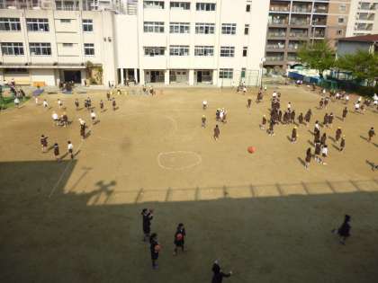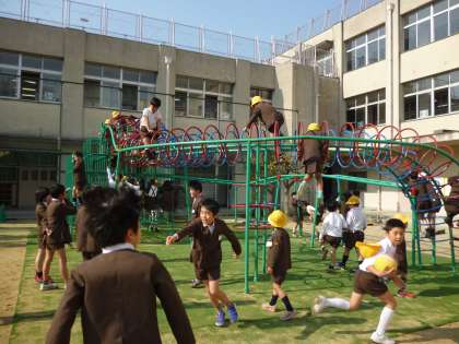 昨日のうっとしい天気から一転、今日は快晴となりました。校庭には、昨日の雨が残り使えないところを避けて遊んでいます。