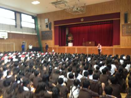 今日は、運動場の状態が悪いので、講堂で全校朝会を行いました。