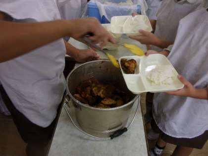 3年生の教室では、みんなで協力して配膳がすすんでいました。煮もののおかずは量を上手に加減して、ごはんは2人で順番によそっていました。みそカツは一人2まいをごはんの次に仕切りの中に上手に入れていました。