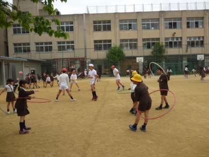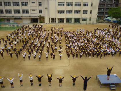 朝の朝礼で、ラジオ体操を実施しています。今日は昼から天気が崩れるようで、それまでの休憩時間は、運動場で目いっぱい遊びます。
