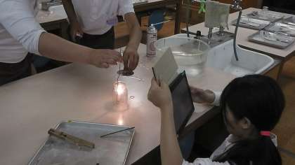 酸素を水上置換法で集気びんに集め、ろうそくの火や線香、木の燃え方を観察してタブレットに記録しました。