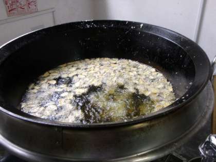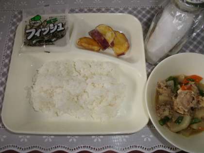 今日の献立は「豚肉と一口がんもの煮もの、さつまいものてんぷら、ミニフィッシュ、牛乳」でした。さつまいもは、一口大に切って、てんぷらの衣をつけて大きな釜で揚げました。スポーツ交流会で、おなかがぺこぺこになって帰ってきた子ども達に、大人気でした。