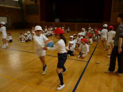 昨日からの雨が校庭に残り、使うことができないので講堂で体育の授業です。2クラス合同なので、走り回るにはちょっと狭いなぁ。
