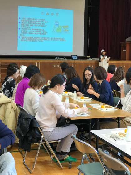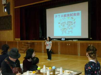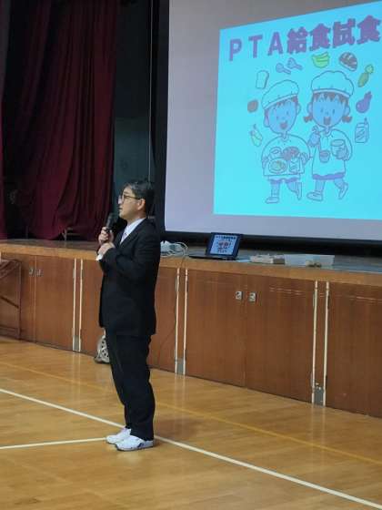 1年生の保護者を対象とした給食試食会を講堂で12時から開催しました。