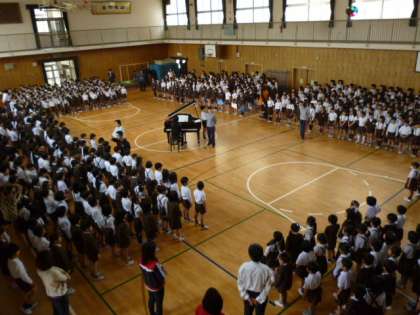 まず始めに、1・2年生が校歌の1番(朝の情景)を、3・4年生は2番(昼)、5・6年生が3番(夜)をそれぞれで歌詞の意味も確認しながら歌いました。さすがに5・6年生は、歌い慣れていることもあり、上手に安定して歌うことができていました。
