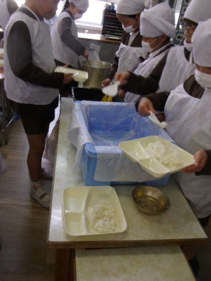 いつも残さずしっかり食べる4年生は、ごはんを大盛りに入れすぎてさあ大変、最後の数人分が足りなくなりました。