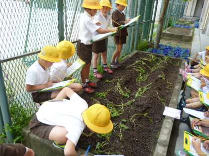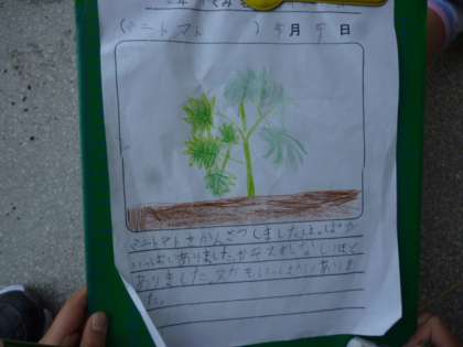 さつまいもとトマトを植え付けして、観察記録をつけています。