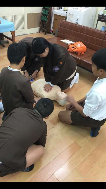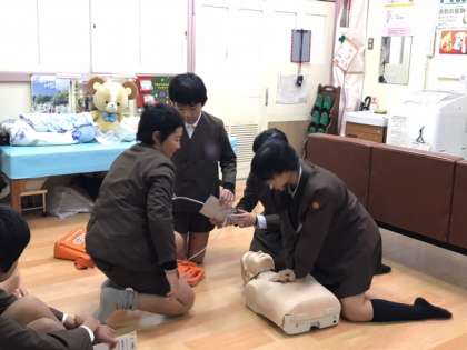 西消防署より、練習用AED・人形をお借りし、実際に子どもたちが心肺蘇生(心臓マッサージ)を行っています。
