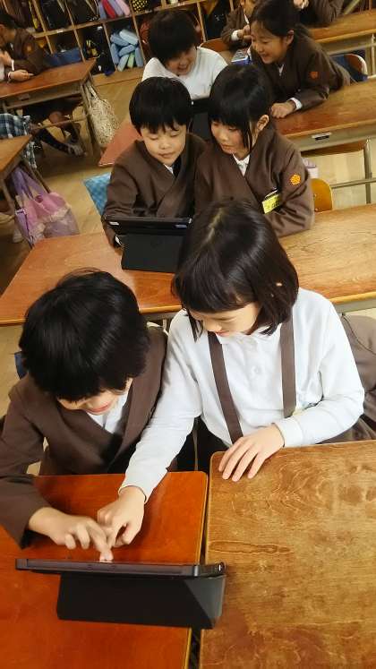 タブレットの「発表ノート」という機能を使ってみようと、お友だちと相談しながらお絵かきを楽しみました。2人で描いた絵をスライドショーで確かめました。学習に生かせるようにしていきたいですね。