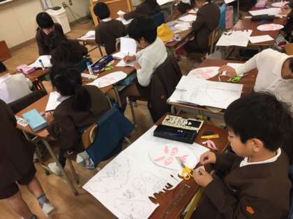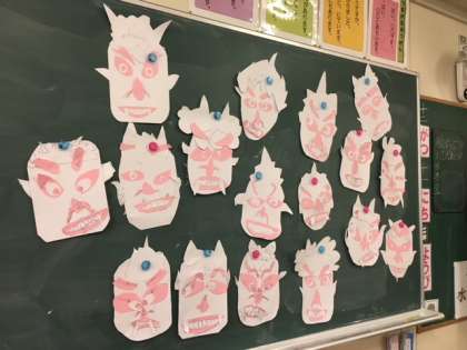 今日は、図工の時間に、紙版画の下地(鬼の顔)をつくりました。