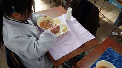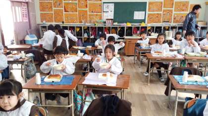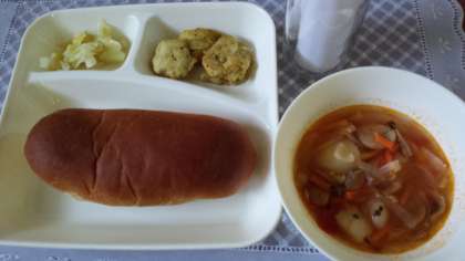 みんな静かに給食を食べていましたが、ミネストローネの底に沈んだアルファベットマカロニを見つけて、自分のところには何が入っているのかを探しました。一つも入っていない人は、入れてもらいました。おかわりもすぐなくなり、楽しい給食時間でした。