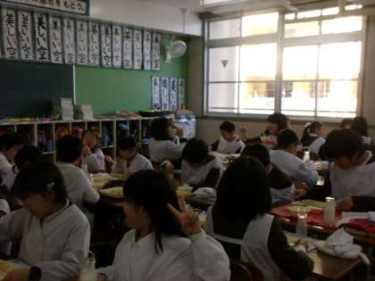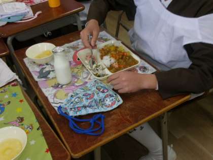 いつもと違うメンバーがいる学級はちょっと緊張するようでしたが、「もっと増やしたい人!」という合図があると、大好きなカレーなので遠慮なく行列ができました。大盛りにしてもらって、もりもり食べていました。