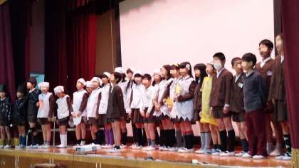 朝の児童集会で、給食委員会の発表がありました。1月の給食週間に向けて練習をしていましたが、お休みの人が多いので1週間遅れで発表しました。野菜嫌いの子ども達に、妖精が野菜の大切さを教えてくれるという内容の、笑いありクイズありの楽しいひとときでした。