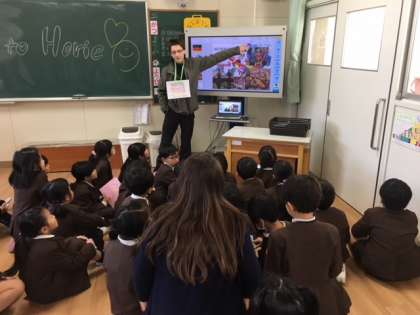 一年生の教室に、海外からきた留学生のセチルさんとトルステンさんが来ました。