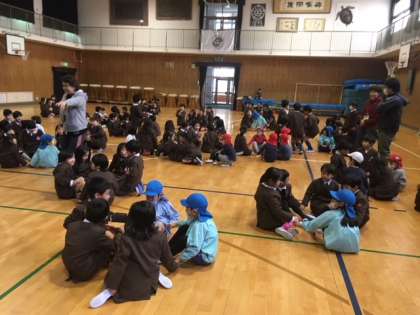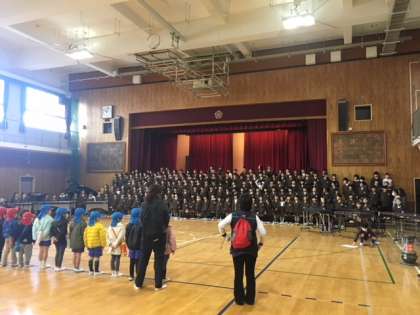 初めに、ミッキーマウスマーチの演奏と「ともだちになるために」の合唱を聴いてもらいました。お返しに、「どっきどきの1年生」を歌ってくれました。