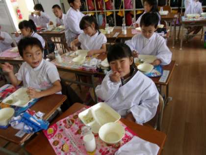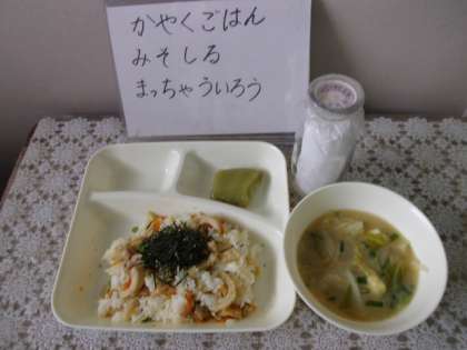 今日の給食は「かやくごはん、みそ汁、まっ茶ういろう」でした。まっ茶ういろうは、和風のデザート献立として考えられた一品です。砂糖、まっ茶、上新粉、水を混ぜ合わせ、1クラス分ずつをミニバットに入れて、焼き物機で蒸します。教室でふたをあけると、まっ茶の香りが漂い、ほんのりと甘い「和のスイーツ」でした。一年生は最初、口々に「これはなんだろう?」と言っていましたが、食べてみると「おいしい!」と言いながら、たくさんの子ども達がおかわりをしました。