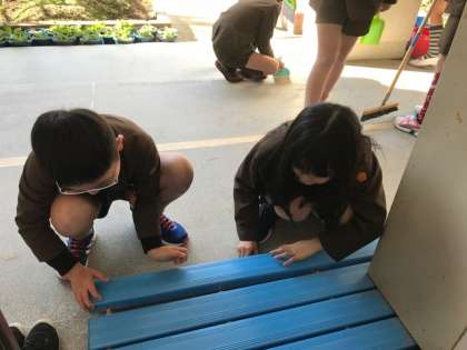 保健室前のすのこを持ち上げて、下にある砂まで上手に掃除しています。