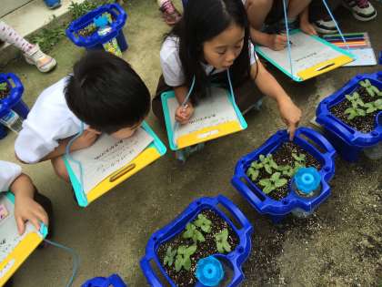 みんな自分のあさがおの芽をよくみて絵にかきました。