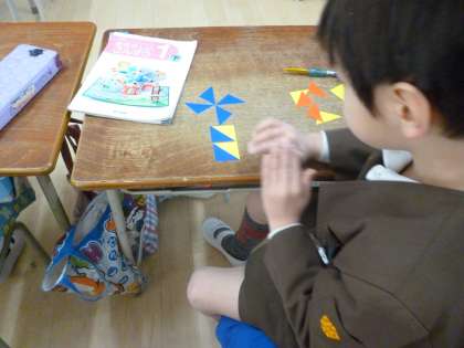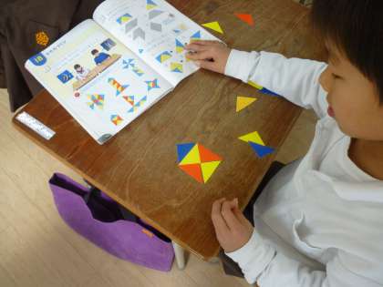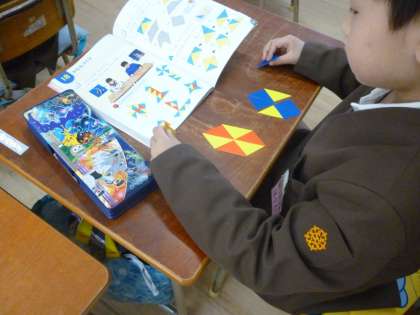 算数の学習で「いろいたをつかってかたちづくり」をしました。算数の本を見ながら、色板を並べて形をつくりました。