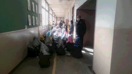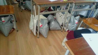 園児は上手に机の下に避難しています。