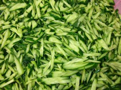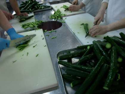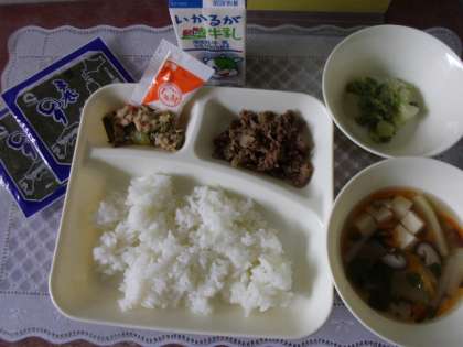 献立は、「手巻きごはん(牛肉の甘辛煮、ツナソテー)、すまし汁、和なしのまっ茶クランブル、牛乳」でした。ツナソテーはツナと細切りのきゅうりをいためるのですが、堀江小学校では22キログラムもあるきゅうりを全て包丁で切りました。食べると、きゅうりの食感と鮮やかな緑も残っていて、とてもおいしく食べることができました。