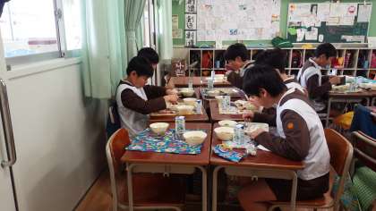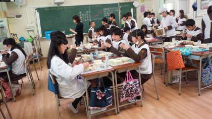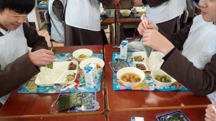 6年生の教室では、ごはんもおかずも増やしたい人がたくさんいて、長い列ができていました。
