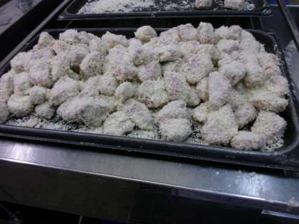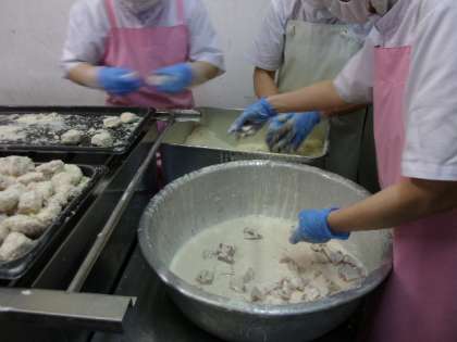 一口トンカツは、一口大の豚ヒレ肉に学校で一つ一つフライ衣をつけました。850人分の一口トンカツに衣を付ける作業はなかなか大変です。