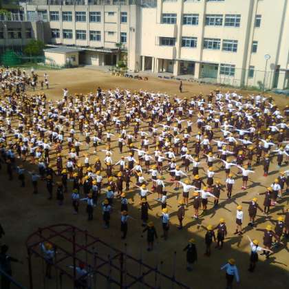 児童朝会で、ラジオ体操を行いました。