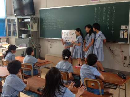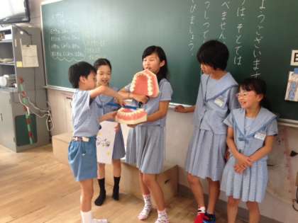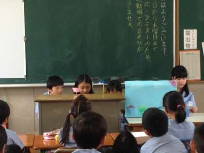 今週から「むし歯サイナラ週間」です。健康委員が各クラスに行き、歯みがきの大切さや歯の磨き方を、劇や紙芝居やペープサート、クイズなどでわかりやすく教えます。