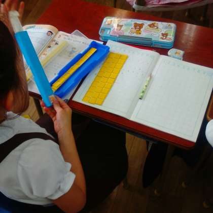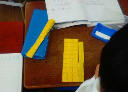 ブロックを使って、引き算の学習をしています。