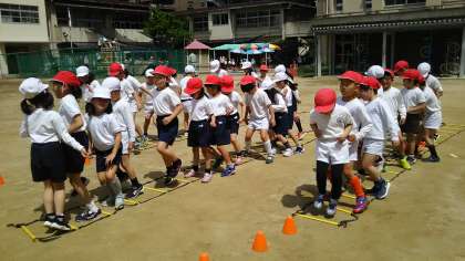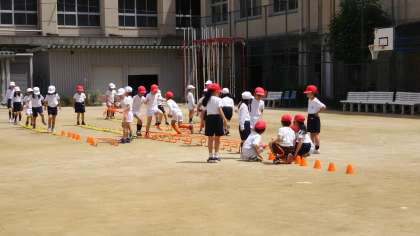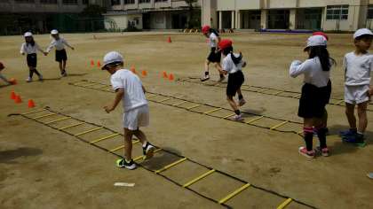 まずは全員で「右・左・右!左・右・左!」とステップの練習をして、ラダーに取り組みました。最後には、ミニハードルやコーンも組み合わせ、自分たちでコースを考え、楽しむことができました。