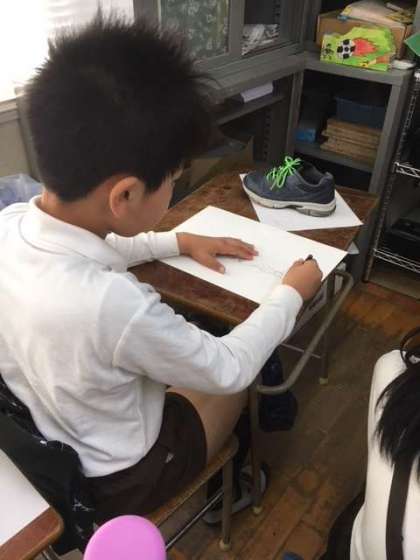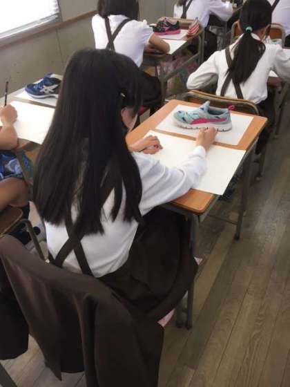 靴をよく見て、縫い目や汚れをしっかりと表現することができています。静かな環境で、一人ひとりが集中して取り組んでいます。