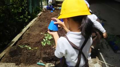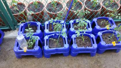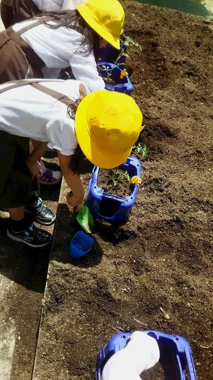 一人一鉢、プチトマトを育てます。苗木が届いたので、植え替えをしました。