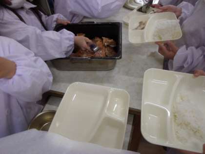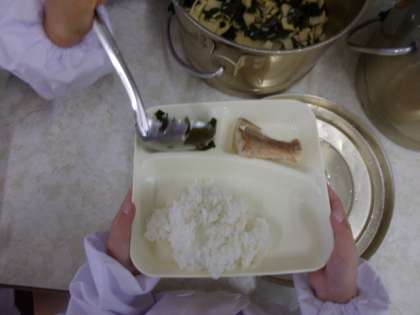 1年生も自分たちで、一生懸命配膳をしています・・・が、赤魚をトングではさむと力いっぱいにぎってしまって半分になったり、わかたけ煮は最初の方の人にたくさん入れすぎてしまい、最後の5人分位がたりなくなったりと大変でしたが、無事終わりました。「いただきます。」をすると、魚やわかたけ煮を減らす人もいますが、しっかりおかわりをしている人もいました。