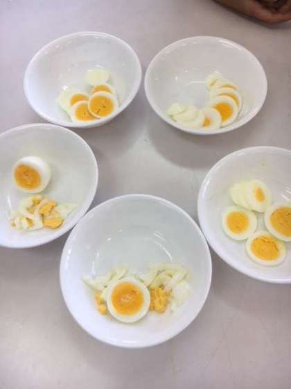 家庭科での調理実習でゆで卵をつくりました。火加減を調整したり、時間を確認したりしながら実習することができました。盛り付けも工夫して並べることができ、充実した実習になりました。
