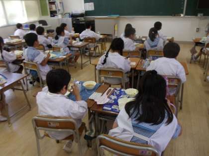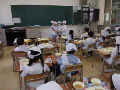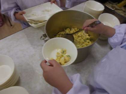 えんどうの卵とじを、小さいおわんにたっぷり入れて配膳を始めましたが、途中で多すぎることに気づいて少し減らして配膳しました。献立名を聞いて、「いただきます」をして食べ始めると、「この魚はなんや?」という声が聞こえてきました。その後、「少しにがいな〜」とか「骨がある〜」などの感想も聞こえてきました。