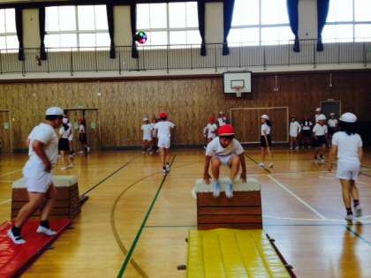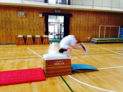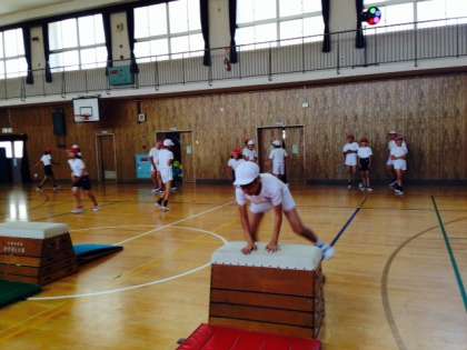 開脚とび、かかえこみとび、台上前転の練習をしました。