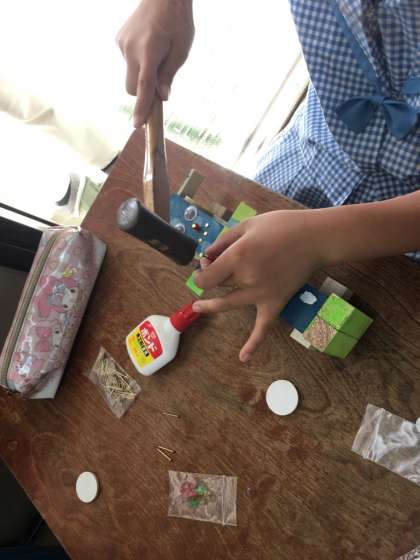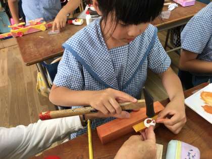 ほとんどの子が初めてのくぎを打ちで、ドキドキしながらくぎを打ちました。