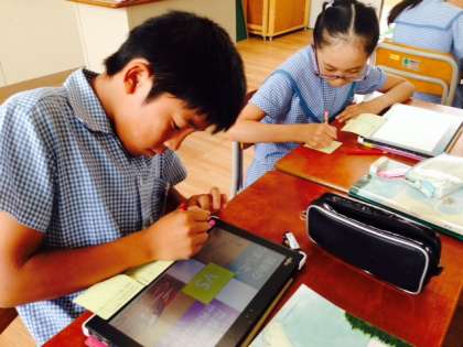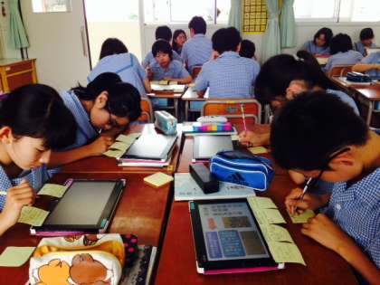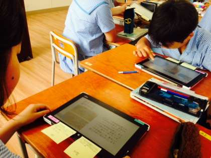 時代ごとの文学について、タブレットでまとめたものをグループで読み合いました。友達のまとめたものに対して、わかりやすかったことやよかったことをコメントし、付箋をはりました。