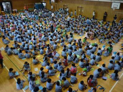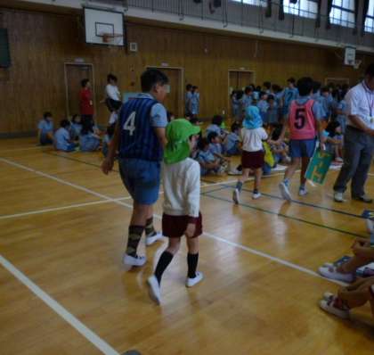 2限目に幼稚園の年長さんを交えて、講堂に800人を超す児童が集まって、縦割り班でゲームをして遊びました。
