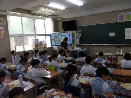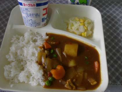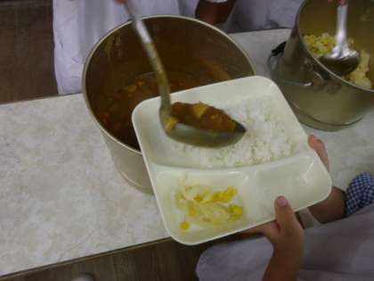 今日は、みんな大好きなカレーライスにヨーグルトもついています。1年生も手際よく配膳して「いただきます」をしました。カレーが少し残ったので、「もっとかけてほしい人は」と先生が言うと、たくさん手が上がりました。