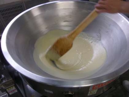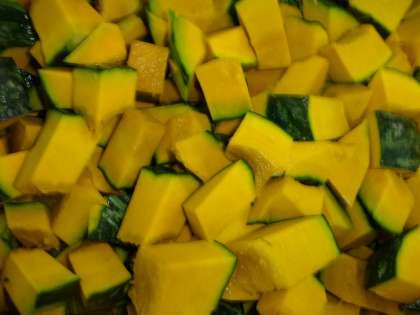 今日の給食は「レーズンパン、かぼちゃのクリームシチュー、キャベツと三度豆のサラダ、和なし(かんづめ)、牛乳」でした。給食のクリームシチューのルウは、小麦粉をていねいに炒めて作ります。仕上げに牛乳とクリームも入れたので、コクがあり、かぼちゃの甘みがミルクの風味に包まれたオレンジ色の濃厚なクリームシチューに仕上がりました。
