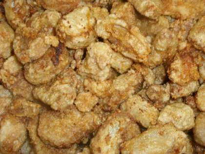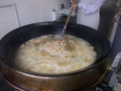 今日の献立は「ごはん、豚肉の香味あげ、みそ汁、きゅうりの甘酢づけ、牛乳」でした。角切りの豚肉は、しょうがや濃い口しょうゆで下味をつけて、でんぷんをまぶし、大きな釜にたっぷり油を入れて、からりと揚げました。きゅうりは輪切りにして、甘酢につけたので、口の中がさっぱりとしました。