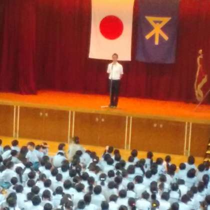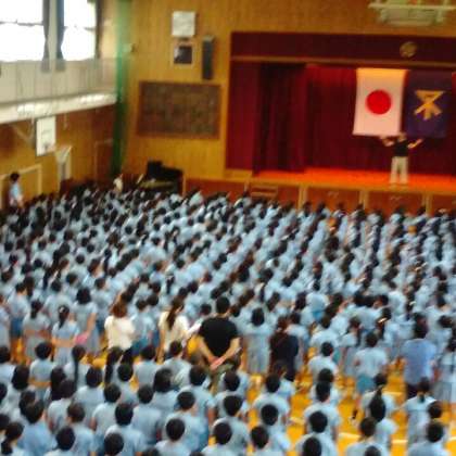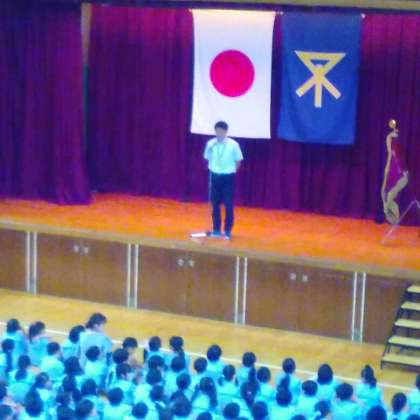 「夏休みの過ごし方」「プール水泳について」の話を聞いた後、全員で元気よく「校歌」を歌いました。