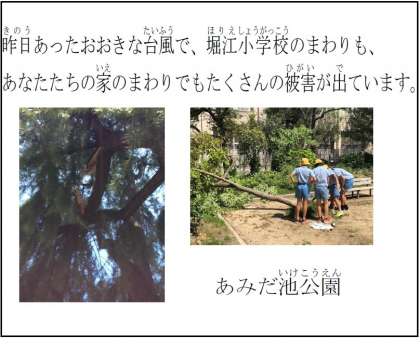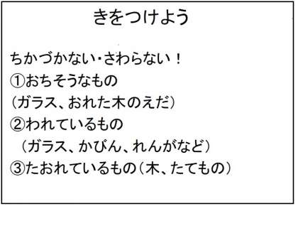 放課後等の過ごし方について学校でも指導いたしましたが、台風の片づけが不十分な場所もあると思われますので、気をつけて過ごすようにご家庭でも話ししてください。
