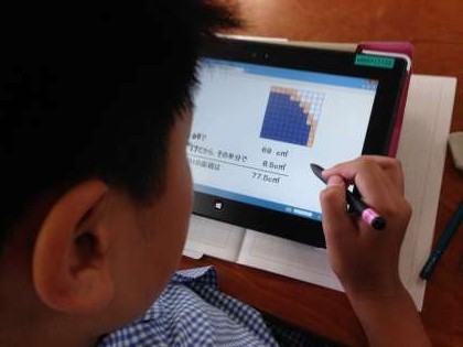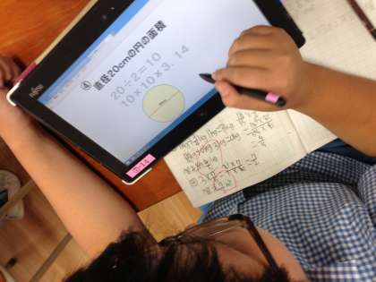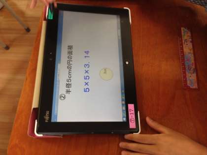 算数の学習では、タブレットを使って円の面積を求める方法を考える学習をしました。その後、円の面積(半径×半径×円周率)の公式を考えました。