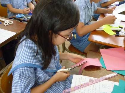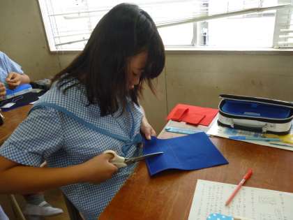 家庭科で小物づくりをしています。