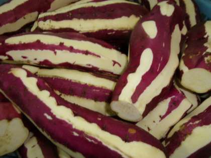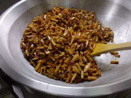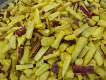 今日の献立は「食パン、アプリコットジャム、豚肉といかの中華煮、大学いも、ミニフィッシュ、牛乳でした。堀江小学校で大学いもを作るのに、49キログラムのさつまいもを使いました。小さく切って、からりと揚げて、甘い蜜をからめて作ります。