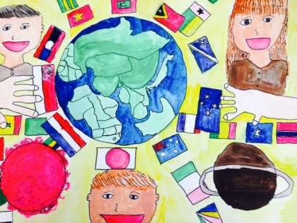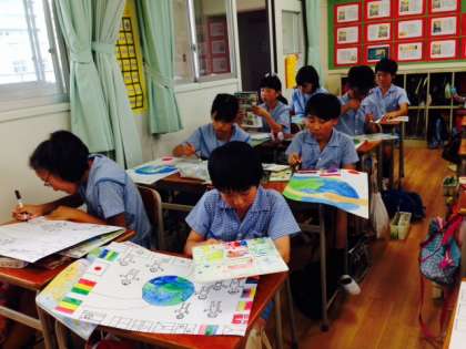 平和ポスターに絵の具で着色しています。
